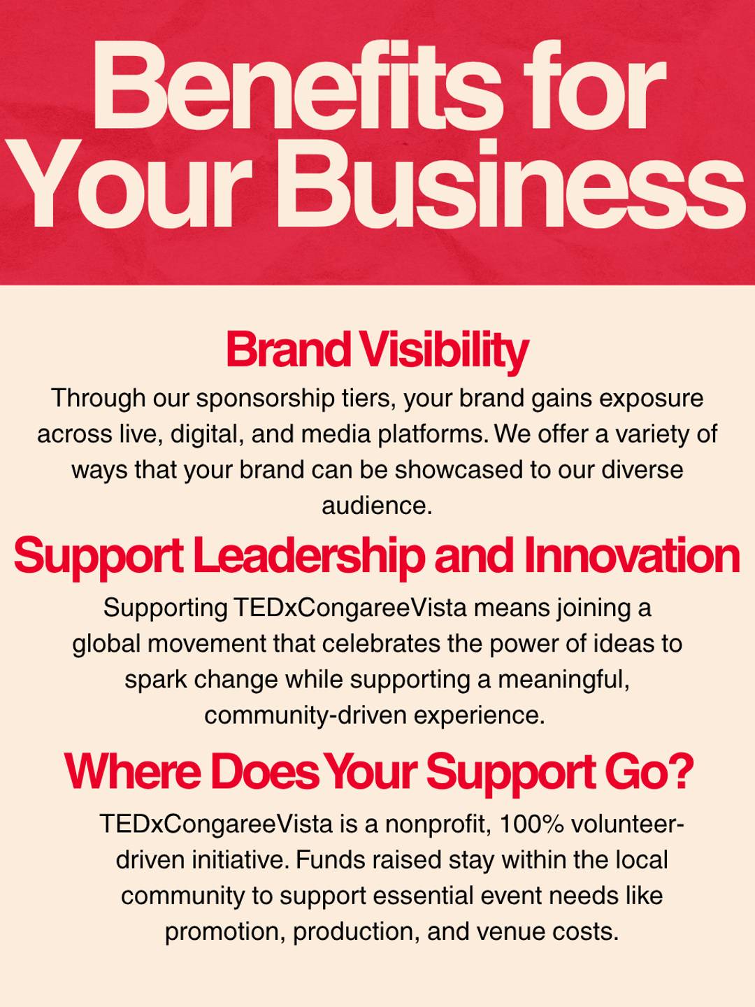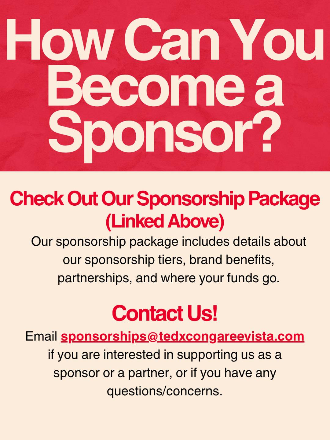 If you or your organization are interested in partnering with us, email: sponsorships@tedxcongareevista.com